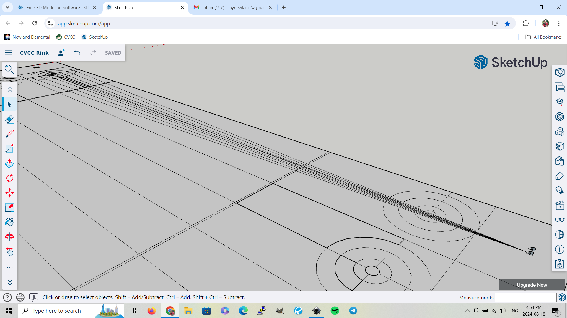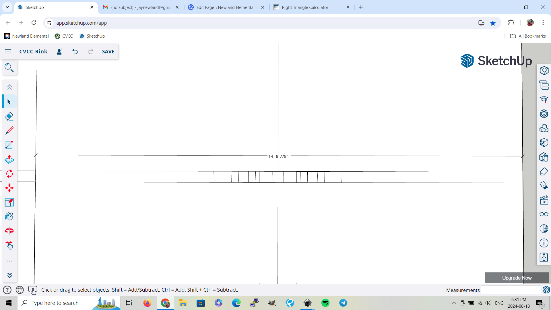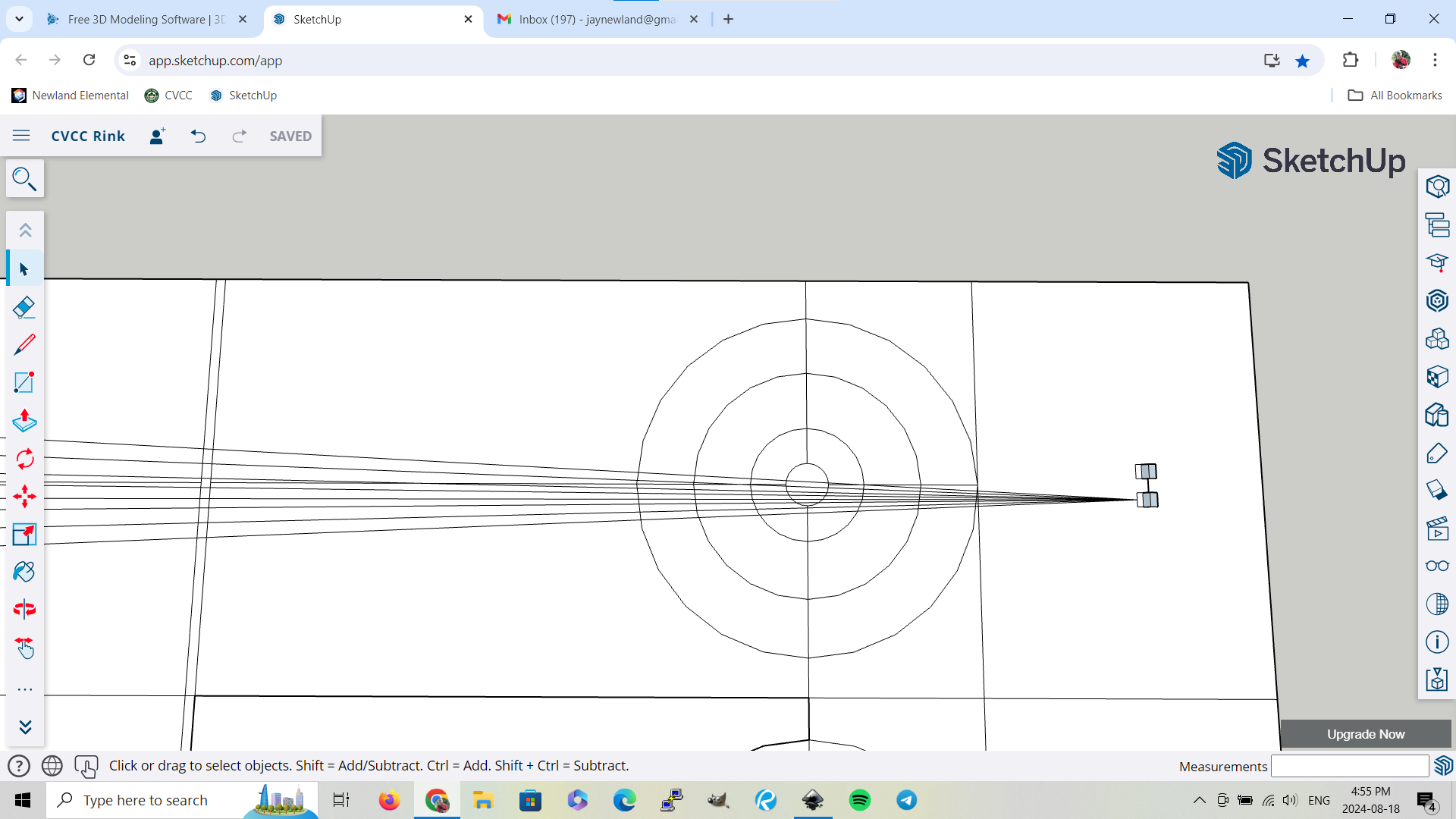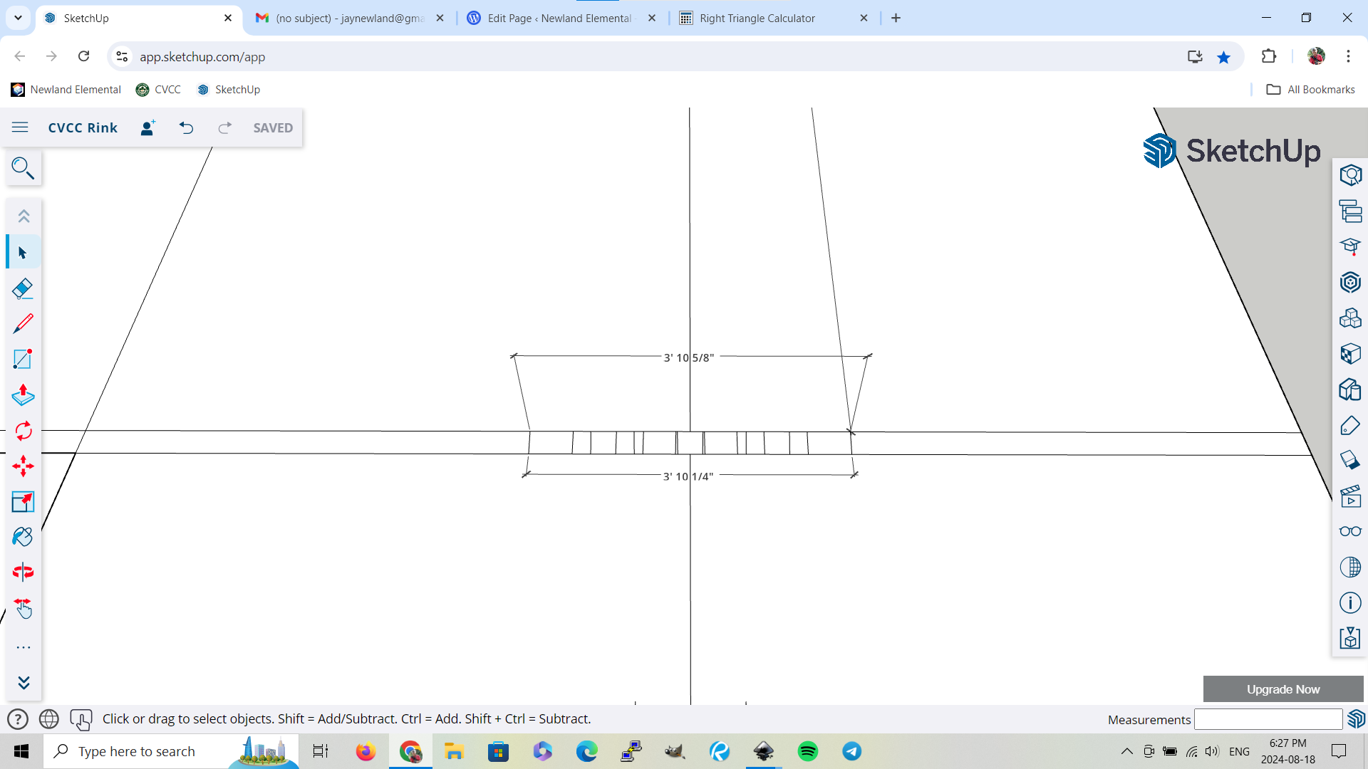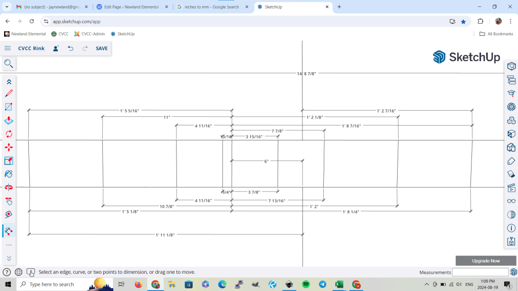 The 5 screenshots above illustrate how SketchUp was utilized to draft a curling rink layout to scale. Lines of delivery were added from the middle of each hack (left and right) to the edges of the 12 ft, 8 ft, 4 ft, and button. The 5th image shows the measurements the lines of delivery (righties hack only) create as they cross the hog line (4″). These measurements were used to draft a custom hog line.